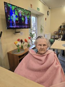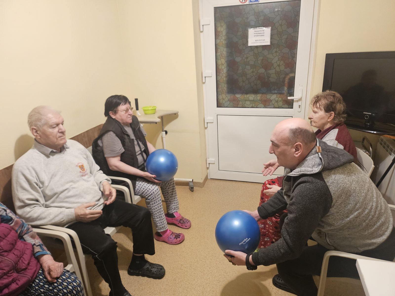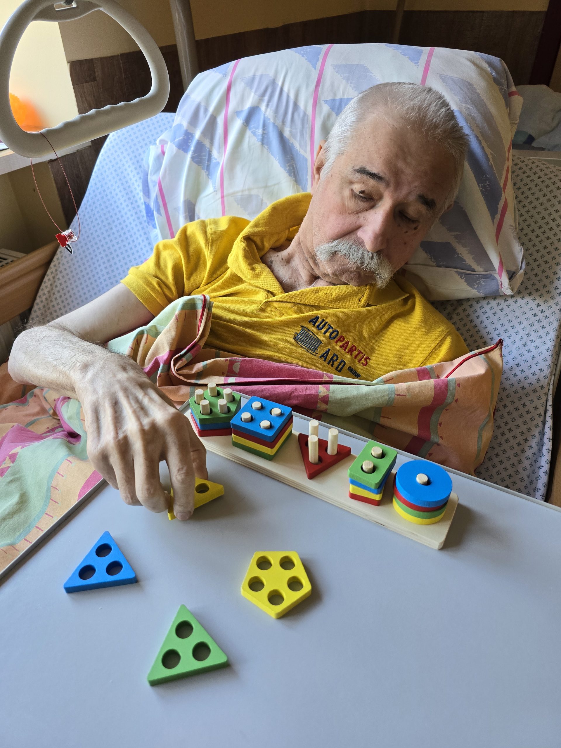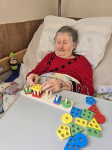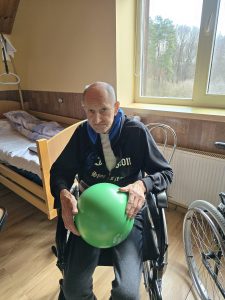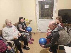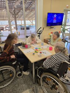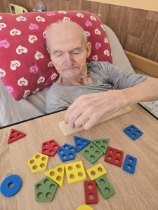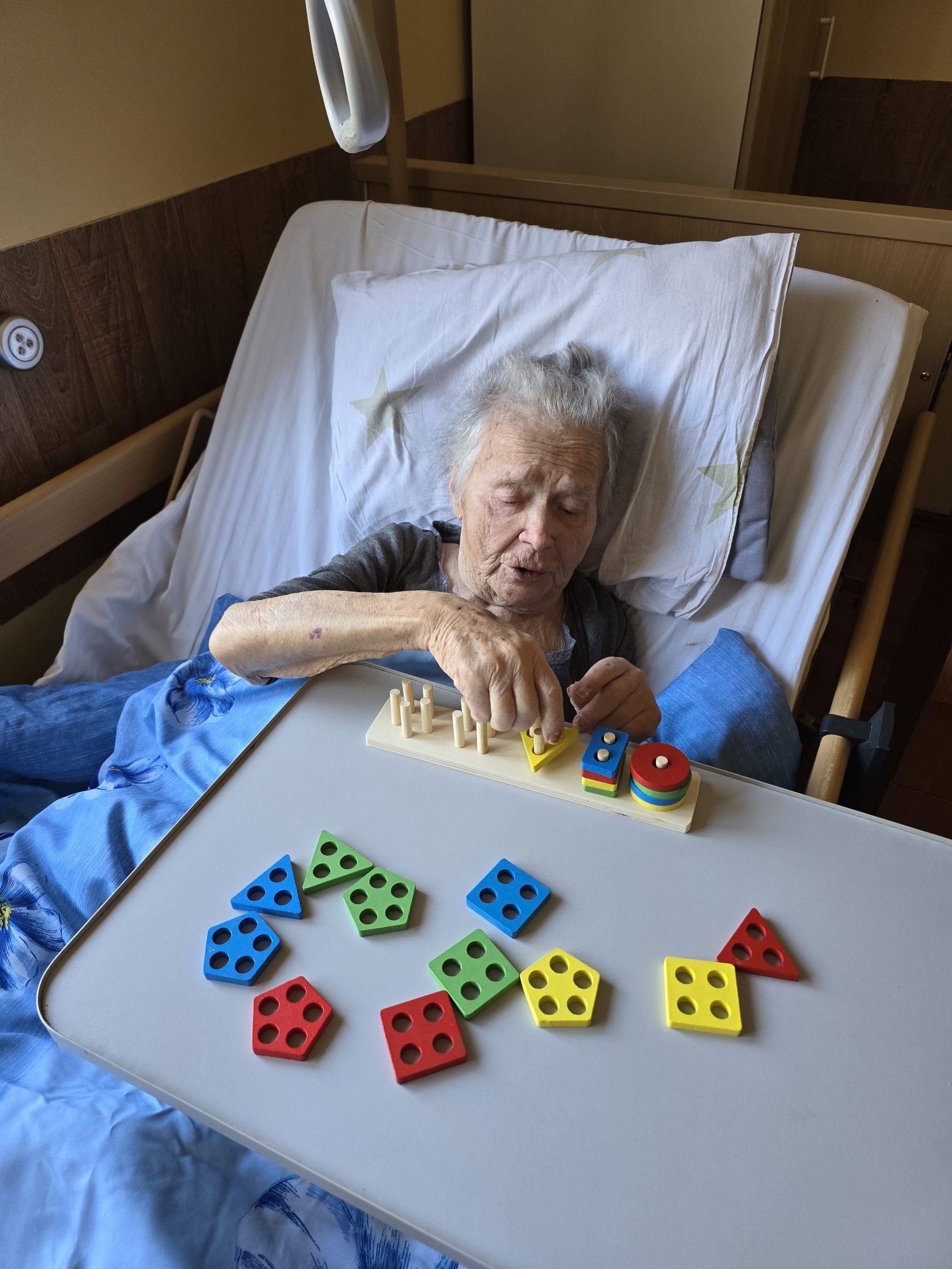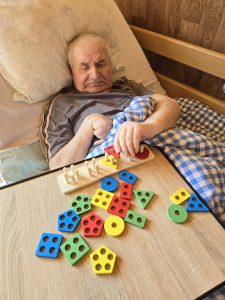 Šiandien gyventojų kambariuose vyko mankšta, kurios metu buvo skatinamas fizinis aktyvumas ir judėjimas. Su kai kuriais gyventojais dėliojome figūrėles su skylutėmis – tai ne tik smagi veikla, bet ir puikus būdas lavinti rankų judesius bei koordinaciją, nes reikėjo tiksliai uždėti figūrėlę į jai skirtą vietą.