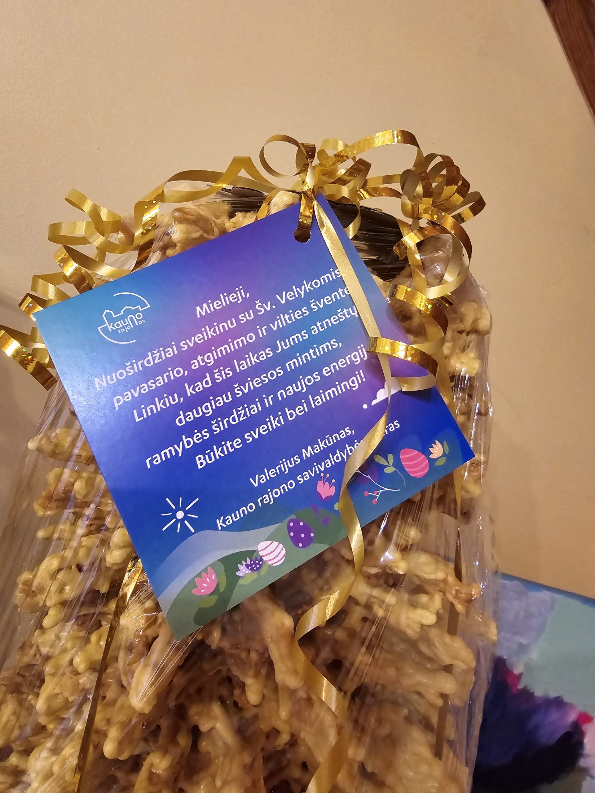 Įstaigoje apsilankė Jolita Andrulytė, Samylų seniūnijos seniūnė, kartu su pavaduotoja Jolita Ripinskienė. Viešnios atvyko su šilta žinia ir dovanomis – nuo Kauno miesto mero perdavė du šakočius bei nuoširdžius sveikinimus artėjančių Šv. Velykų proga.